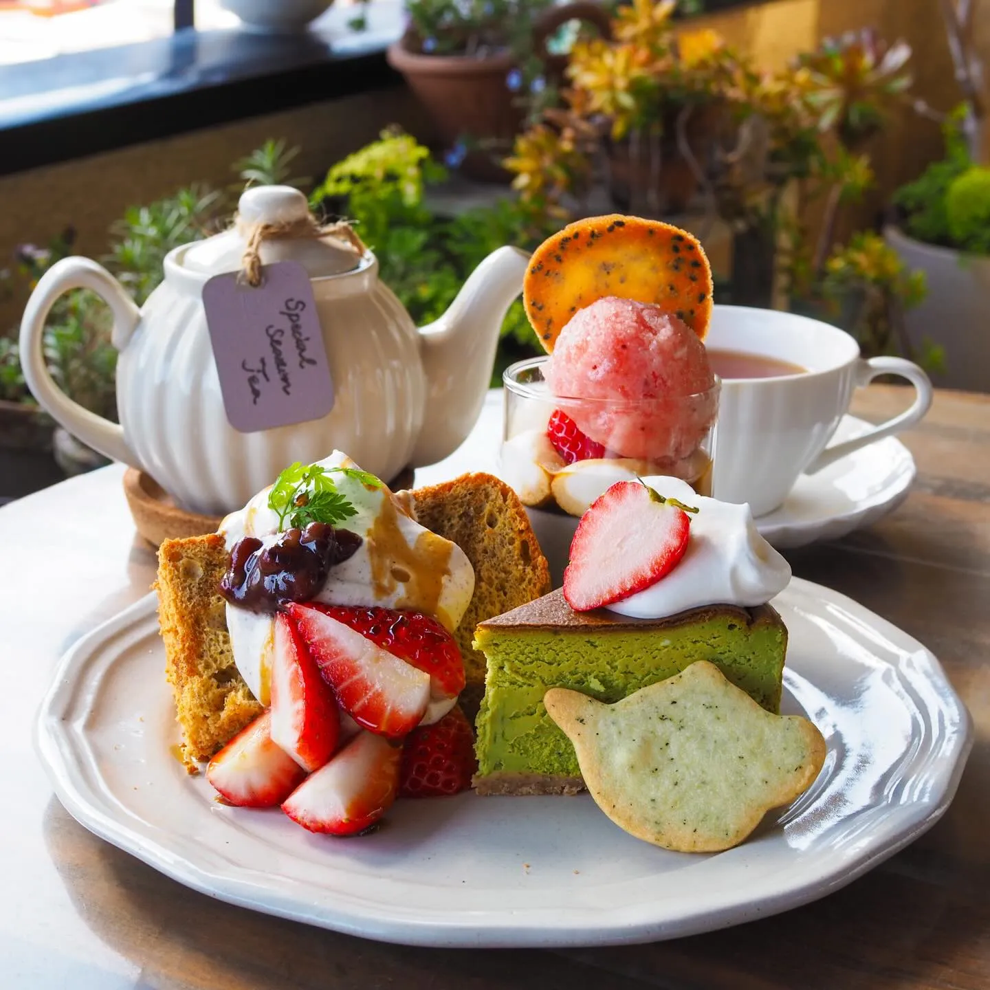 紅茶と焼菓子の cafe Shukuran は、旬の果実を使うプレートと、テリーヌ・ヴェリーヌ・シフォンサンドなど華やかなデザートが特徴のカフェです。桃・メロン・マンゴーなどの果物と紅茶の組み合わせを楽しめます。
