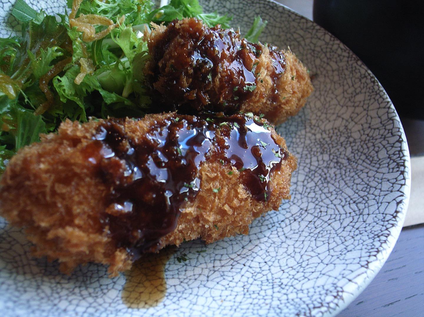 GRデジタルでカキフライとカニクリームコロッケのアップ。...