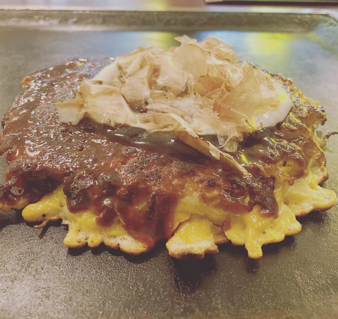 長崎県五島市 お好み焼き てんじゅうさんの「イカ入り お好み焼き」です。僕もすっかり常連になっているお店で店員さんも話しやすくて親切です。