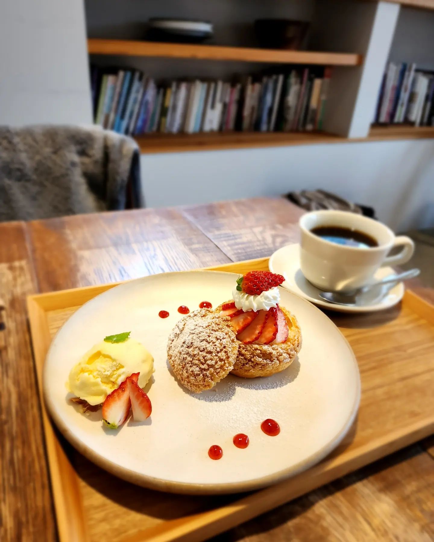 モウデルコーヒーは、土日限定で富士宮浅間神社の隣で営業していたシュークリーム店です。サクサクのクッキーシューとクリームの甘さ、いちごの酸味が絶妙で、イートインでは季節のシューをプレートで楽しめます。子連れも歓迎で、店員さんも丁寧です。