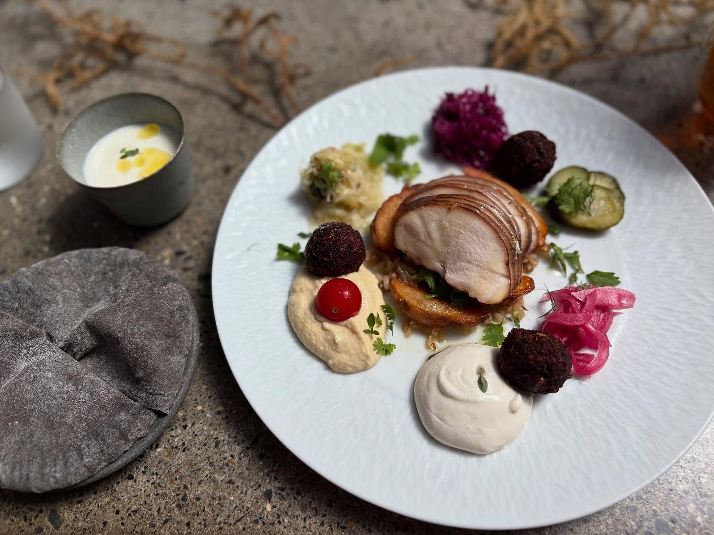 朝ごはんは汽ki:さんで、チキンとファラフェルのプレート。