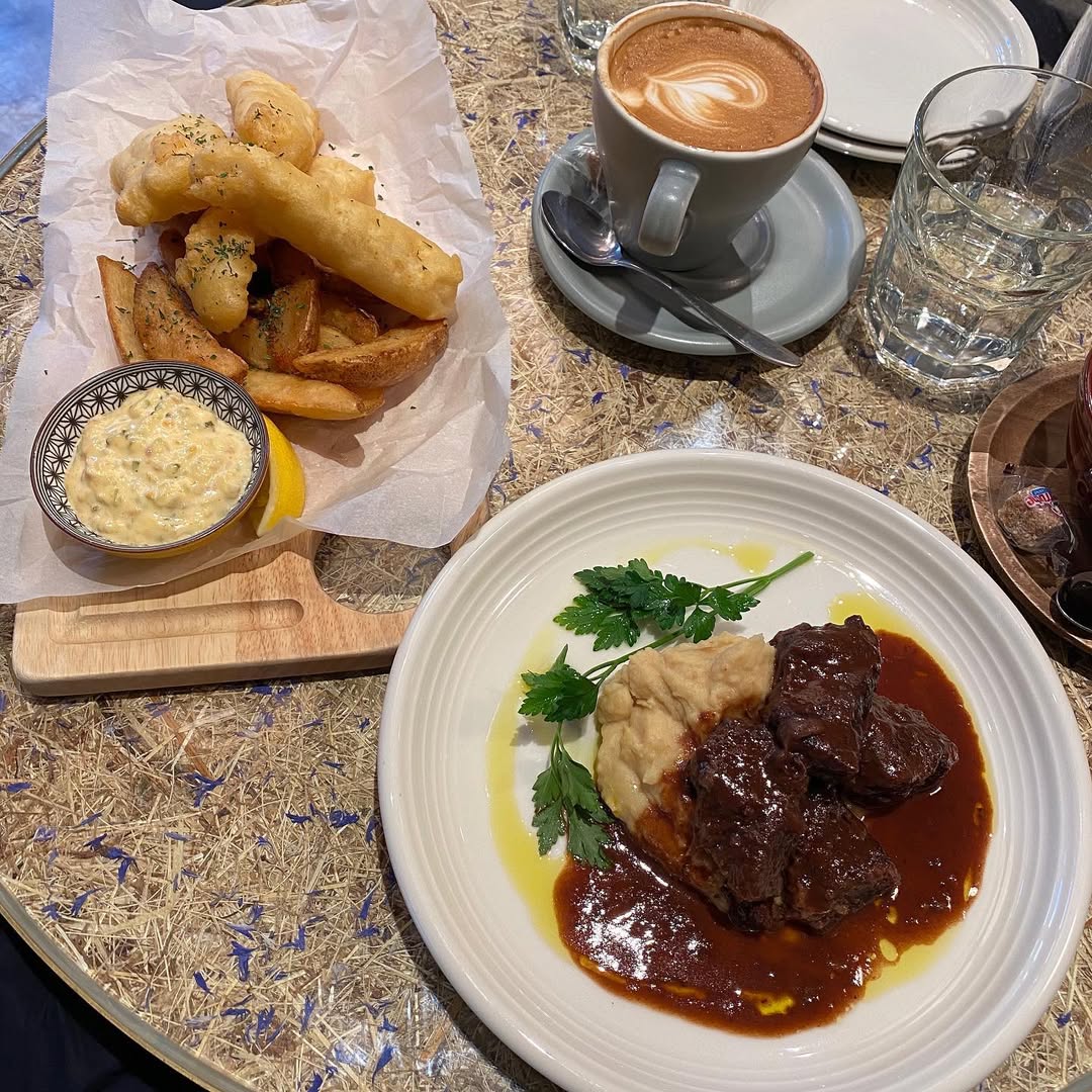 Red wine braised beef. Fish & chips. Ok. And 2 cof...