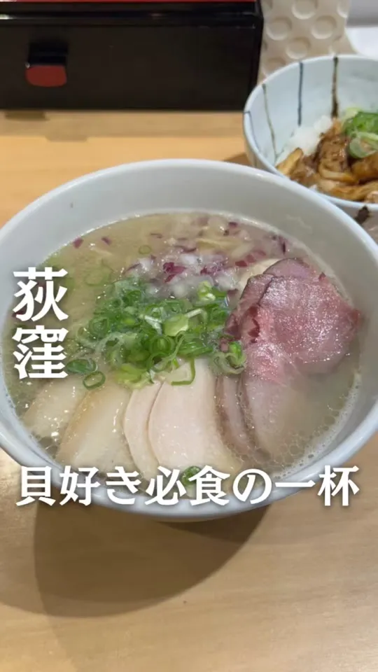 荻窪駅からすぐの場所にある人気ラーメン屋さんに伺いました。その名も「蛤麺しちり」さん。今回は特製貝麺と本日の限定ご飯を注文。スープは自慢の...