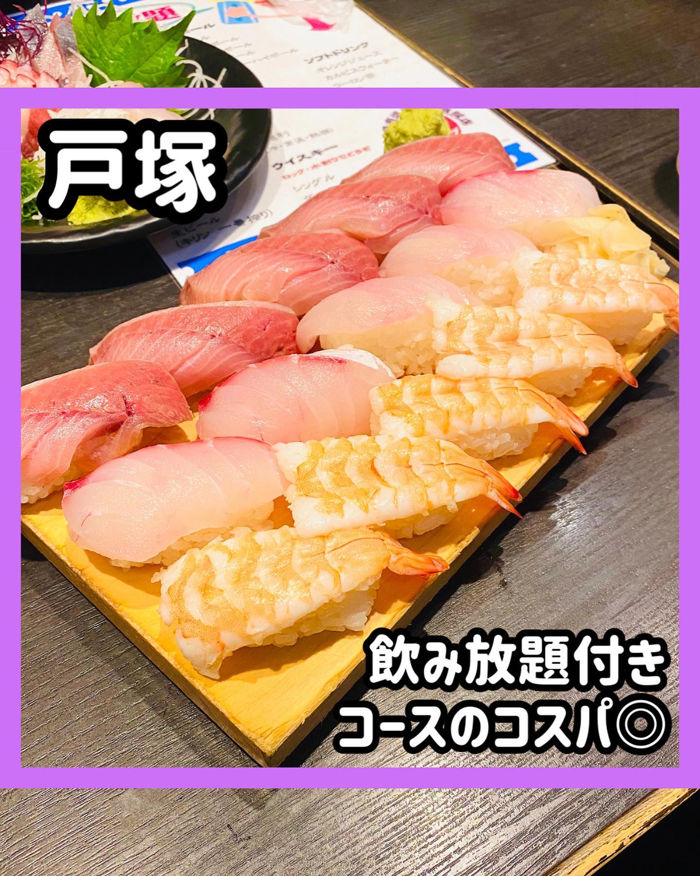 戸塚の海鮮居酒屋七福は、新鮮な刺身とこぼれ寿司、炙りしめ鯖が名物です。昼からの飲みも可能で、昼夜メニューの利用ができます。2.5時間飲み放題付き4,000円コースなどコスパも魅力。夜は全席喫煙可。