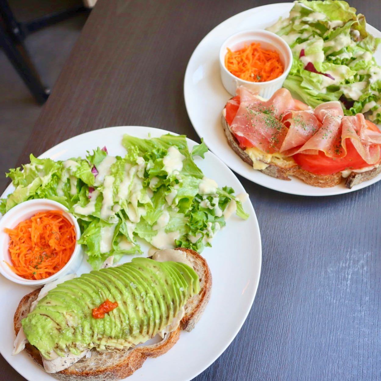 表参道のカフェルポミエは、アボカドをたっぷり使ったオープンサンドと低温スチームチキンを黒オリーブソースで味わえるタルティーヌが看板メニューです。彩り豊かな盛り付けとヘルシーさが魅力で、ランチやブランチにぴったり。おしゃれで落ち着いた空間も特徴です。