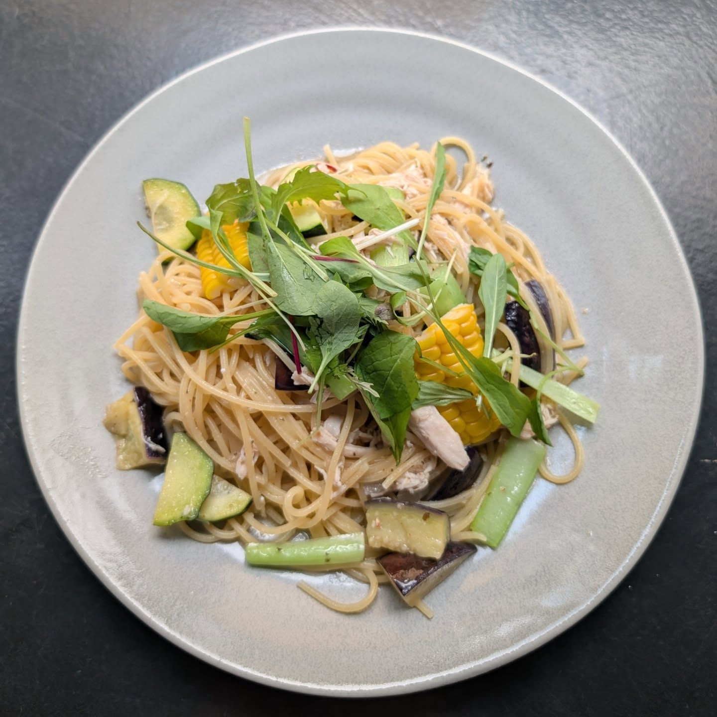 本日は、先輩のお店「エルフリオ」で『蒸し鶏と夏野菜の梅風味スパゲティ』をいただきましたー