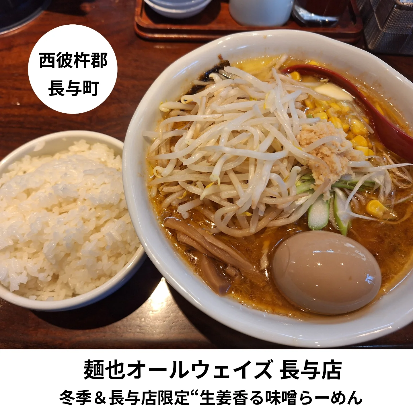 長与店の冬季限定“生姜香る味噌らーめん”をトッピングたっぷりで、ご飯といただきました。