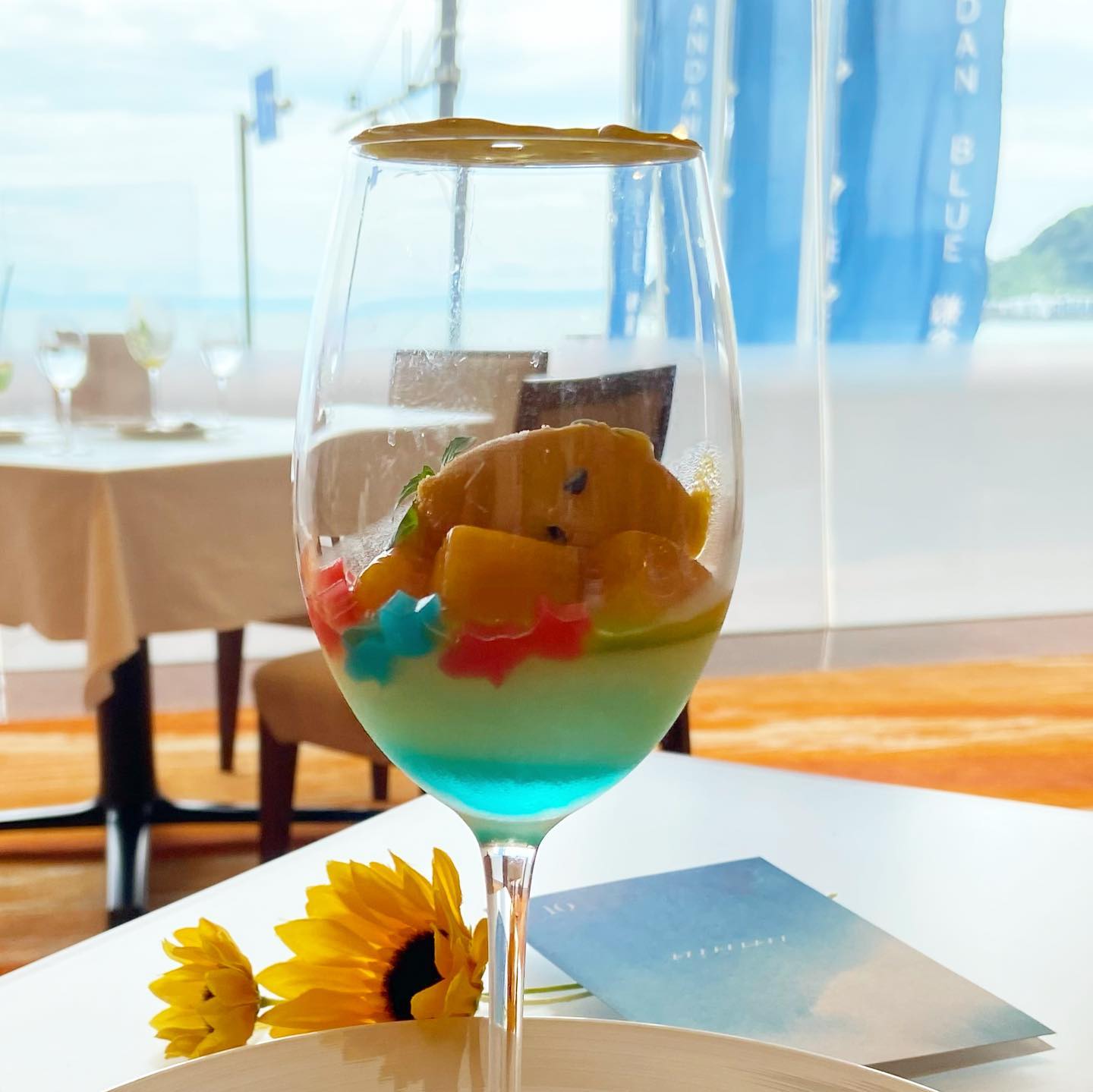 鎌倉のアマンダンブルーは夏季限定でレストランをオープン。2階は海を一望できる空間、3階にはインフィニティプールがあり見学も楽しめます。ランチのカジュアルコース『Menu A』は3850円で、国産牛サーロインのローストと金魚を象ったデザートなど夏らしい構成。パン・コーヒー・紅茶付き、ノンアルドリンクも色鮮やかです。