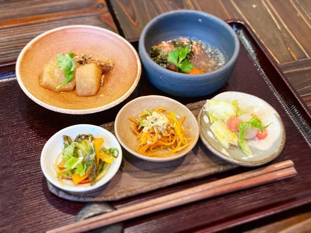 京都市右京区の物味遊山は、食品添加物・化学調味料・GMOs不使用で糖質も控えめ。福井県産蕎麦粉の香り高い蕎麦と、京地鶏たたき韓国風・ひげ鱈きのこ治部煮などが並ぶセット中心。アイスは店主手作りのキウイ、1800円程度で品数豊富です。