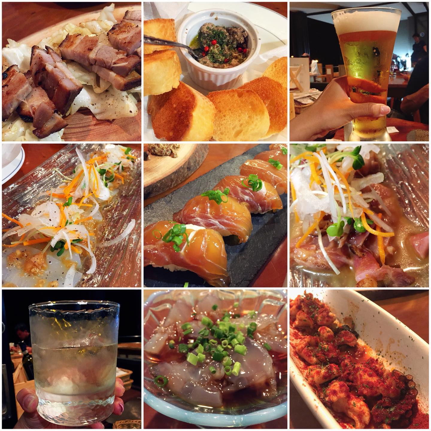 ソデイカのカルパッチョ、鶏のタタキ、タコのガリシア風、クラゲポン酢、島魚のパテ、自家製ベーコン、痛恨の...