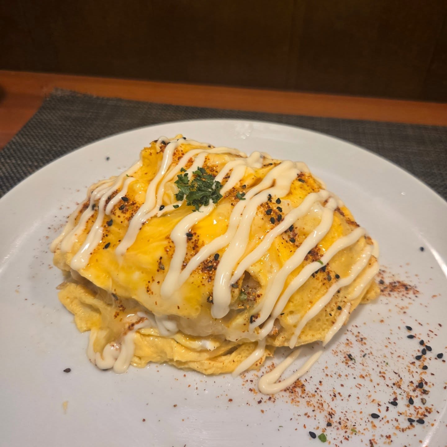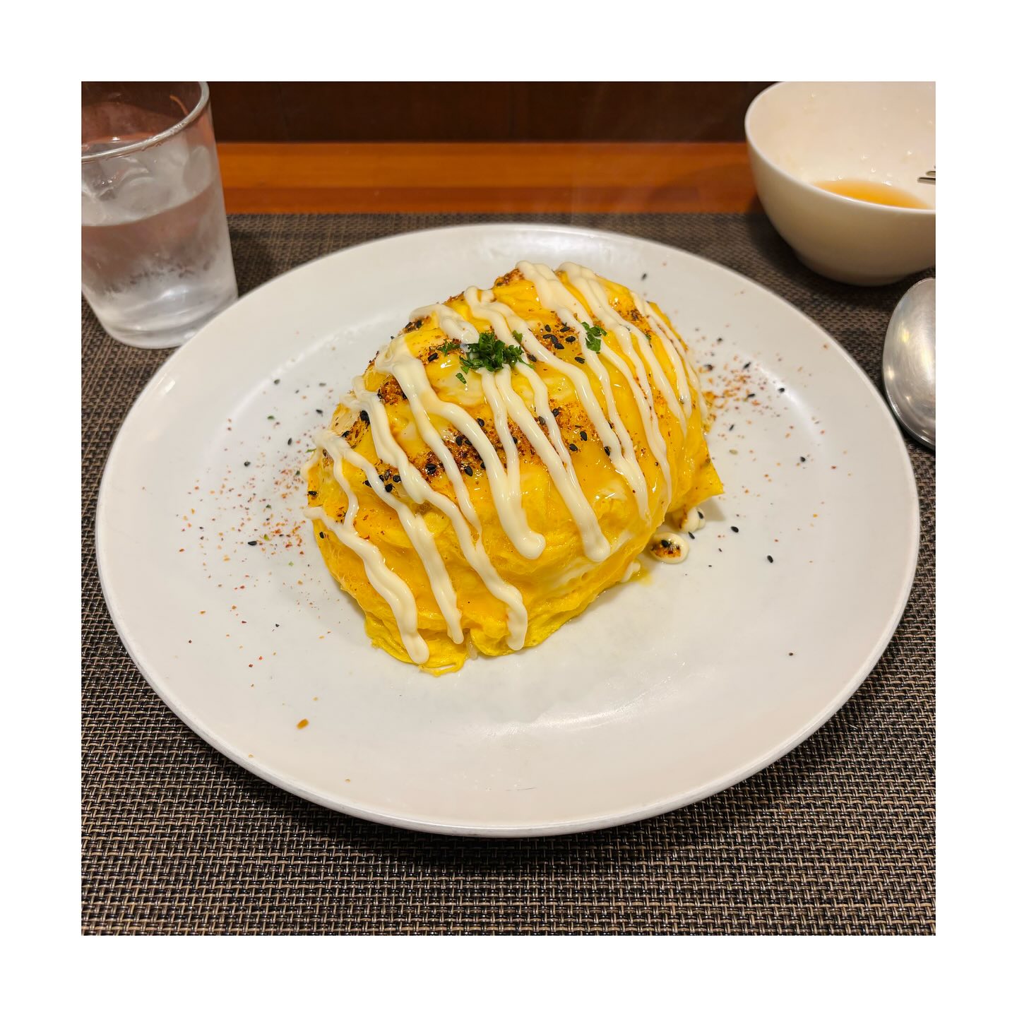 とろとろ玉子に包まれたお醤油風味のチキンライス、上にかかったマヨネーズと七味が良いアクセントに...