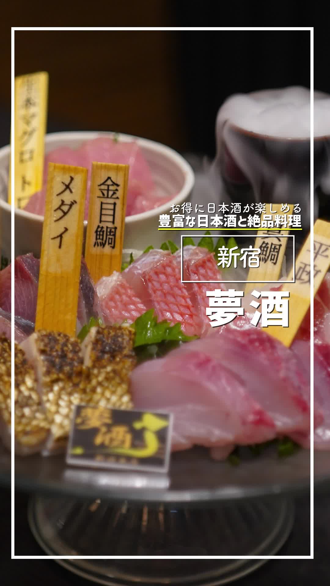 新宿にある『夢酒』は、全国の日本酒を取り揃える居酒屋。料理ごとに合う酒を提案してくれ、名物は新鮮な魚の宝石箱と藁焼きカツオ。飲み比べセットや季節酒も楽しめ、酒好きにおすすめの一軒です。