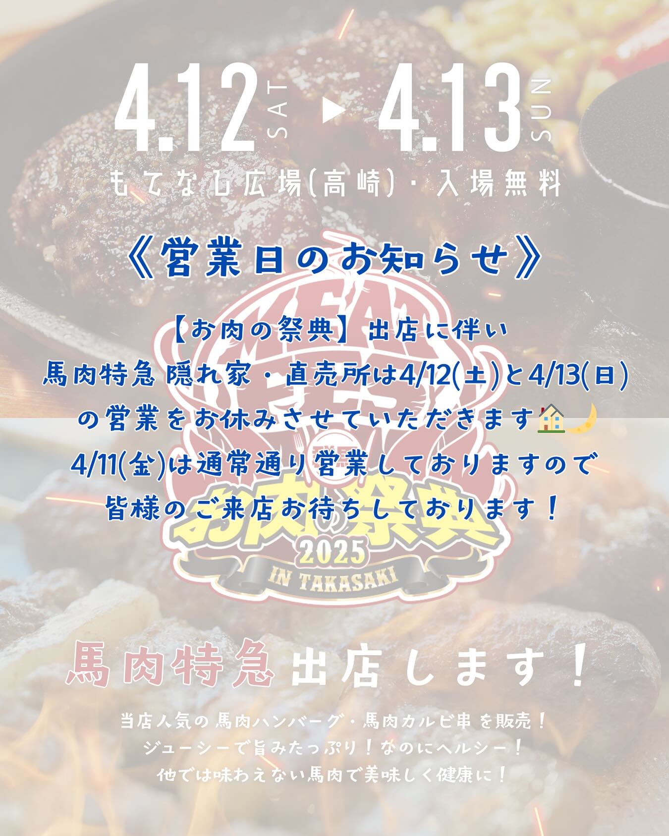 🍖【お肉の祭典】出店につき週末の営業がお休みになります🏠🌙