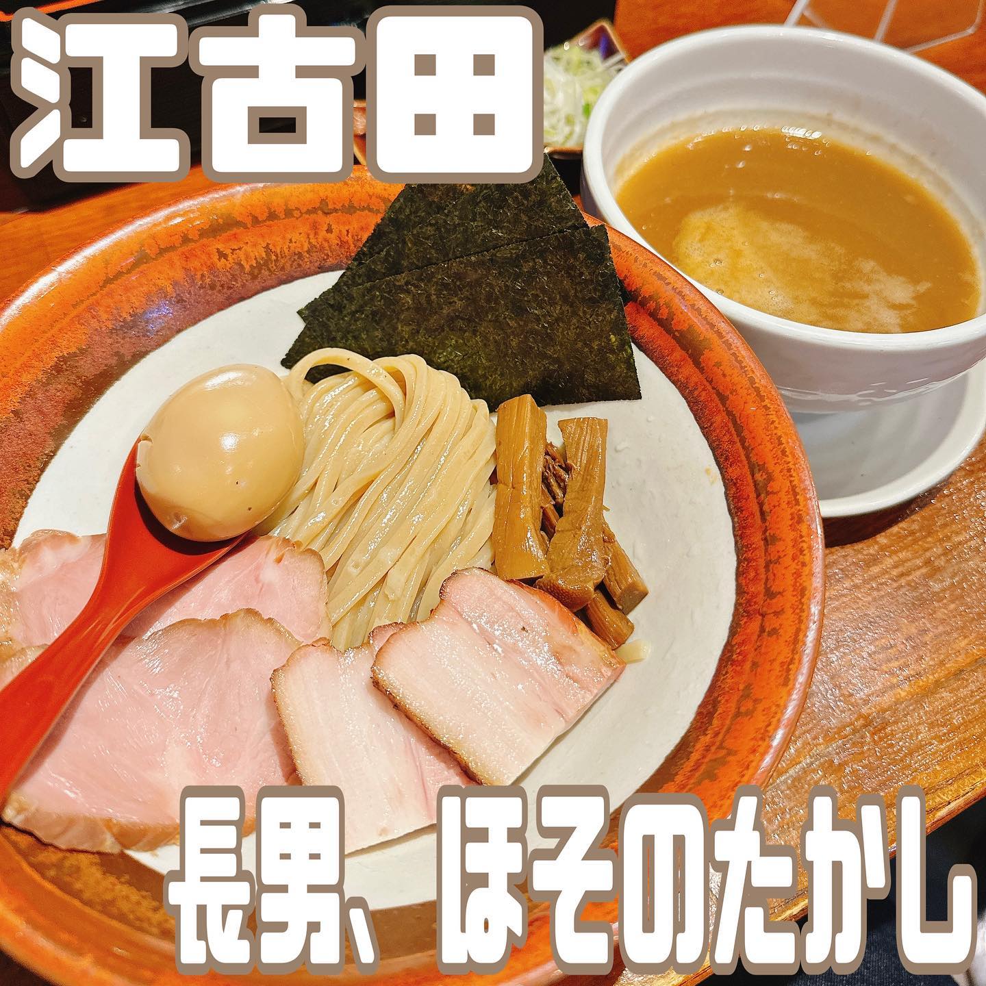 江古田の人気店、長男・ほそのたかしの特製つけ麺は、極太麺100%と超濃厚豚骨魚介スープが自慢。薬味の梅カツオ・鯛出汁・鯛塩が味を引き立て、後味まで深い旨味が広がります。