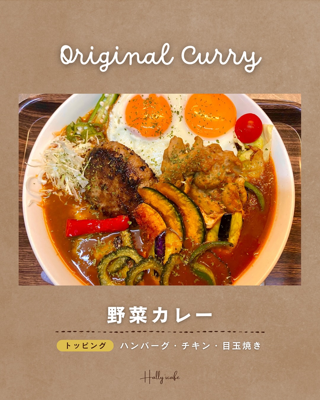 【野菜カレー】に【ハンバーグ•チキン•目玉焼き】を
