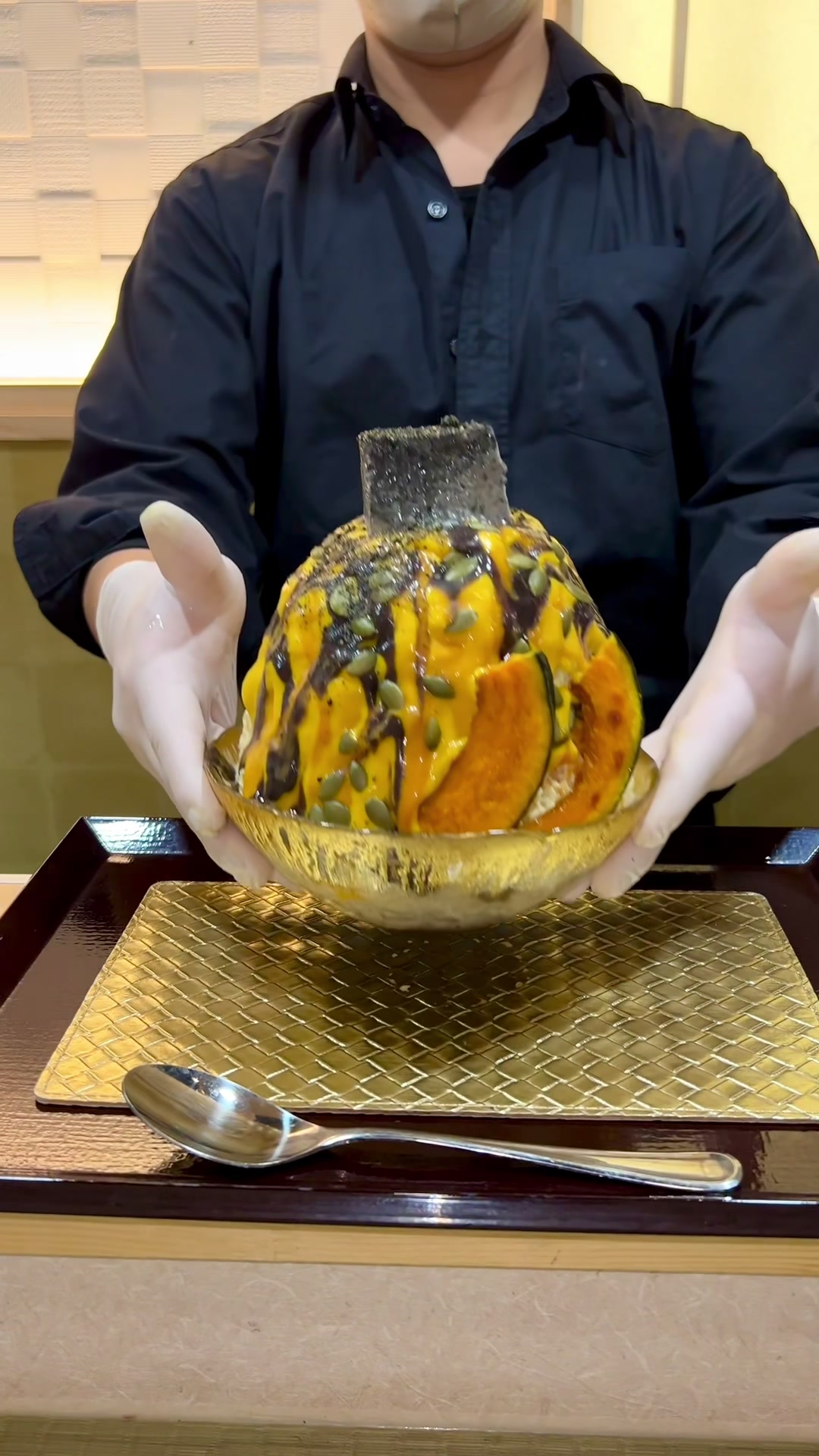 かぼちゃソースと黒ごまプリンがたまらなくおいしいかき氷🤤🎃🍧...