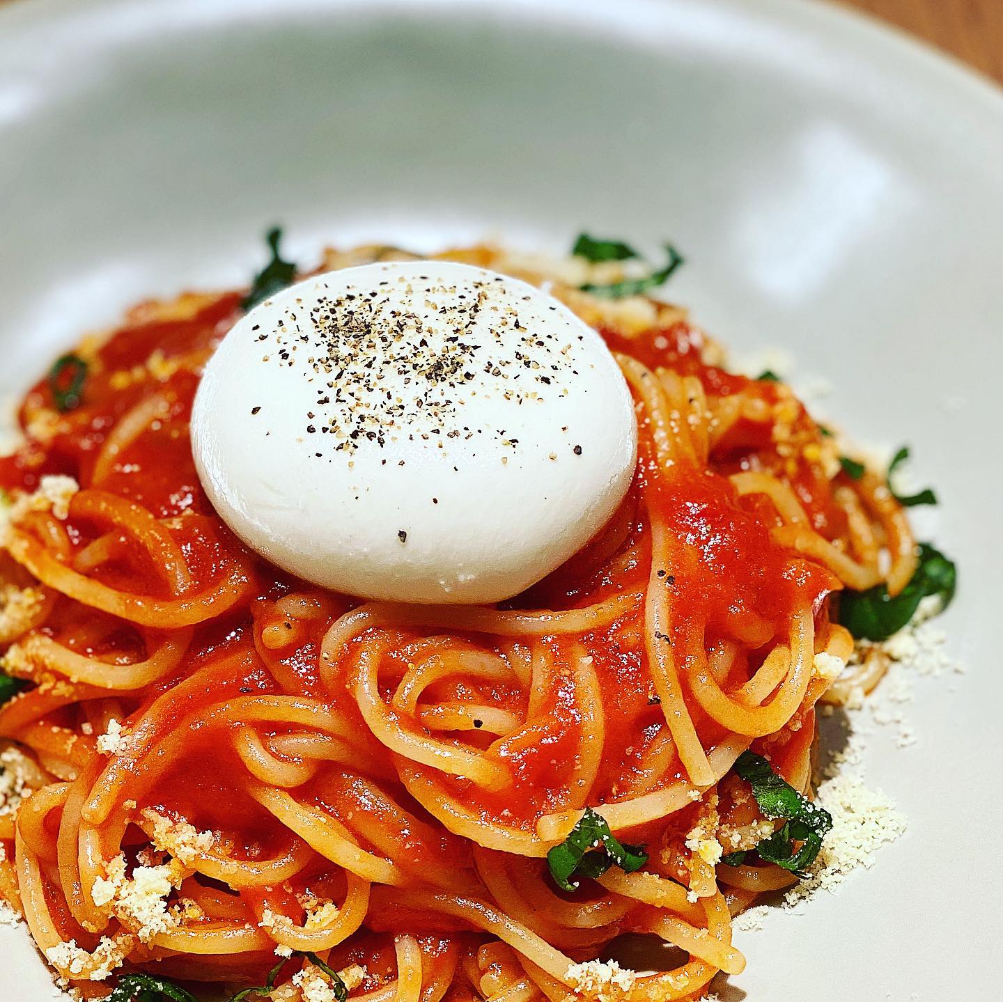 「ブラータチーズを添えたトマトソーススパゲティ」