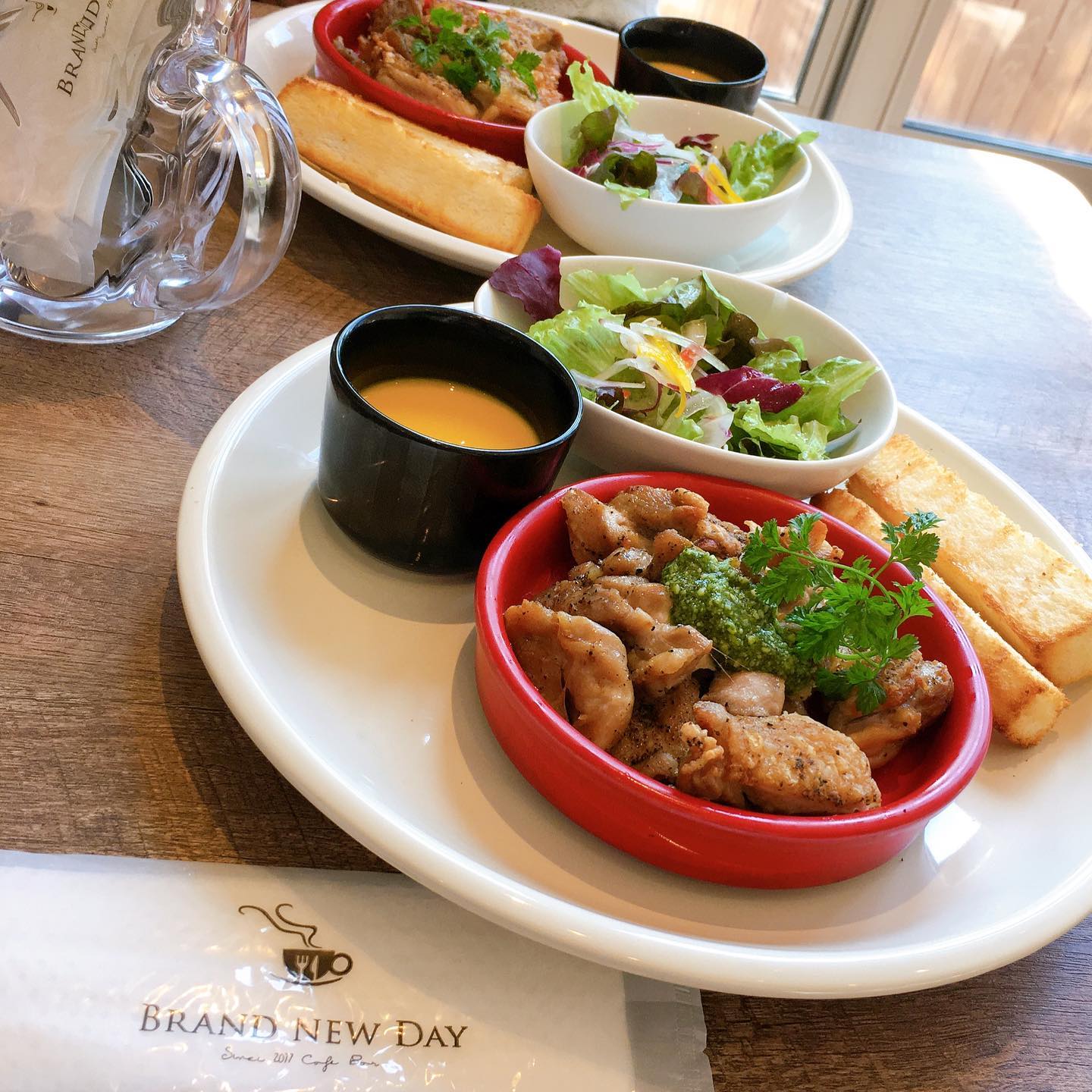 北九州・小倉のカフェ BRAND NEW DAY は、自家製ローストビーフや蜂蜜ブルスケッタ、海老のアヒージョなどを含むディナーコースが自慢。ランチはグリルチキンとパンプキンスープ。ラテアートや温かな接客も好評で、居心地の良い雰囲気が特徴です。